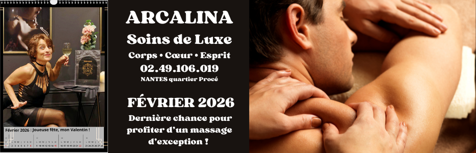 Souvenez-vous, le salon ARCALINA fermera ses portes dans quelques semaines à Nantes. Si ce n'est pas encore fait, parcourez les différentes pages de ce site afin de choisir votre prochain massage : sensuel, naturiste, body-body, intégral, tantrique ou cachemirien... Et si vous hésitez entre tous, le plus simple est de me contacter directement au 02.49.106.019, je me ferai un plaisir de vous répondre et de vous conseiller judicieusement, en fonction de vos besoins, de votre budget et du temps dont vous disposez. A tout de suite, j'attends votre appel !